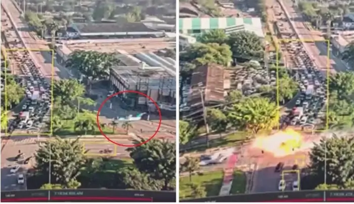 A câmera em um prédio da região registrou quando, às 7h18, a aeronave avança em alta velocidade sobre a via, que seguia o fluxo normal, deixando um rastro de fogo.