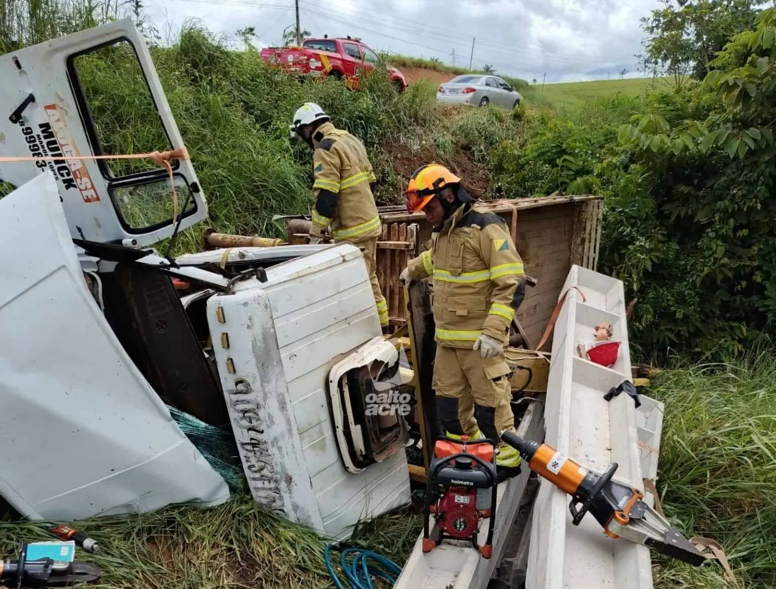 Na tarde deste sábado, 8, um grave acidente mobilizou equipes de resgate na BR-317, próximo ao km 200, em Xapuri. Um caminhão munck, que transportava postes, saiu da pista e tombou, deixando três ocupantes feridos. Um deles ficou preso às ferragens, exigindo uma complexa operação de resgate.