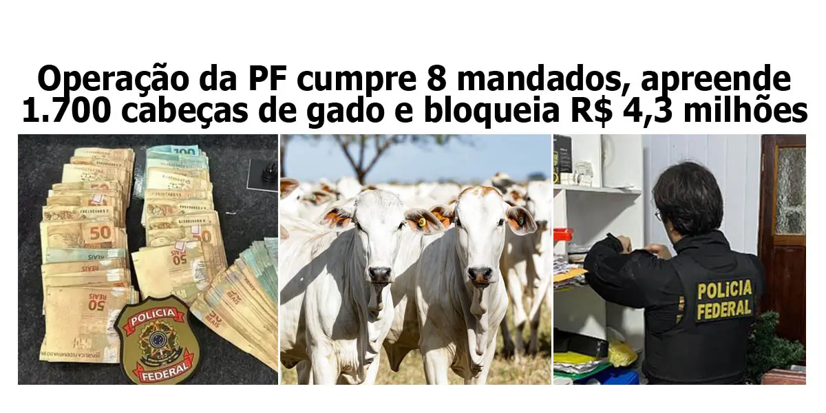 A Operação AgroFuel, deflagrada pela Polícia Federal nesta terça-feira (12), em Rodrigues Alves, cumpriu dois mandados judiciais de sequestro de bens, que resultaram na apreensão de um veículo, mais de 1.700 cabeças de gado e o montante próximo a R$ 580 mil em ativos financeiros, totalizando um bloqueio patrimonial no valor aproximado de R$ 4,3 milhões.