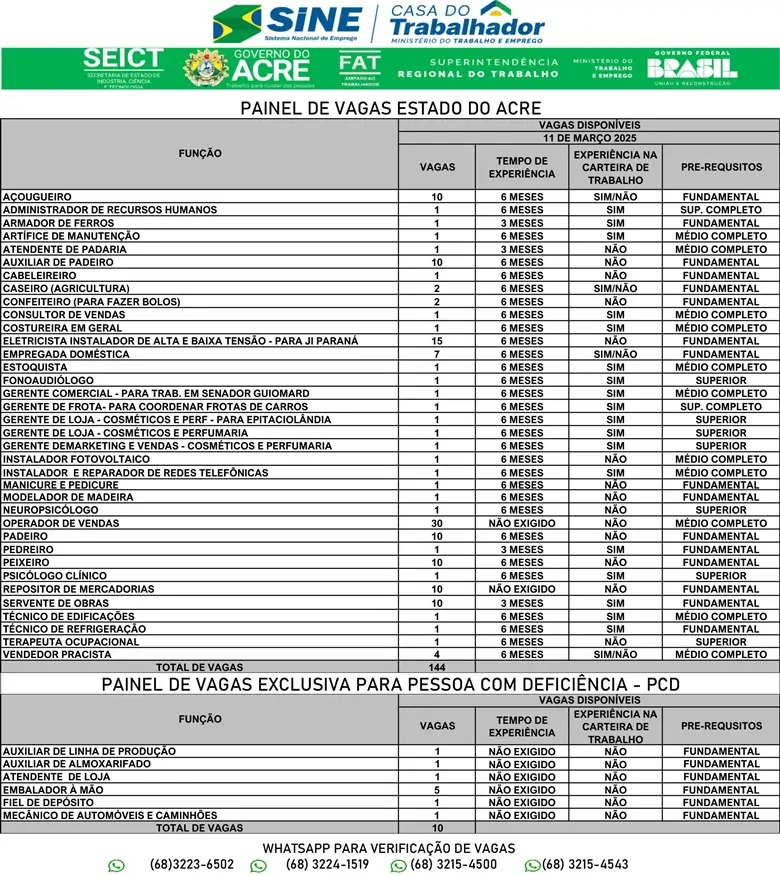 O Sistema Nacional de Emprego do Acre (Sine) oferta 154 vagas de empregos nesta terça-feira, 11, para candidatos com nível fundamental e médio. Há vagas para pessoas com deficiência.