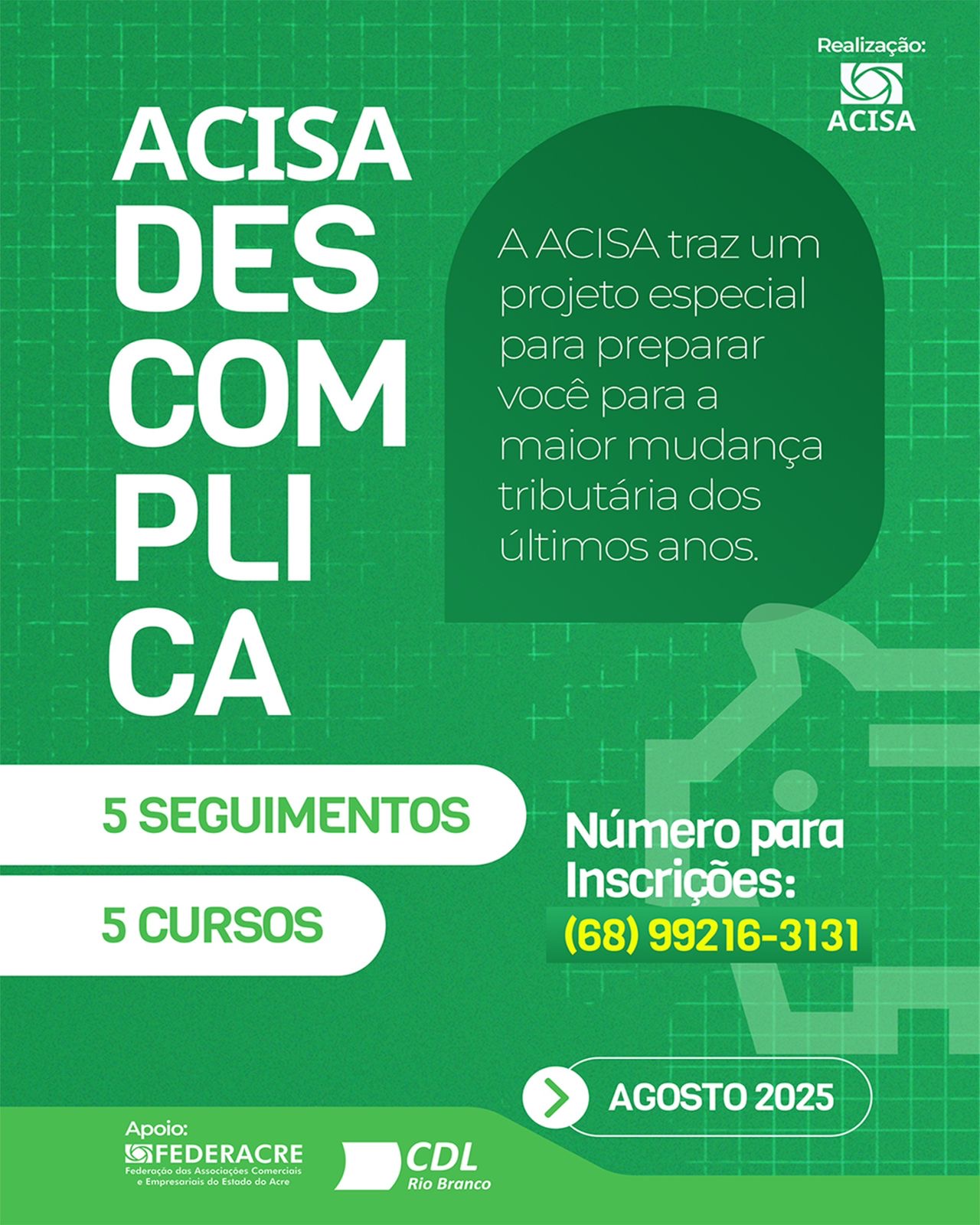 A Associação Comercial, Industrial, de Serviço e Agrícola do Acre (ACISA) está lançando o projeto “ACISA Descomplica”, uma iniciativa inédita voltada para preparar empresários e contadores para a maior mudança tributária dos últimos anos no Brasil.