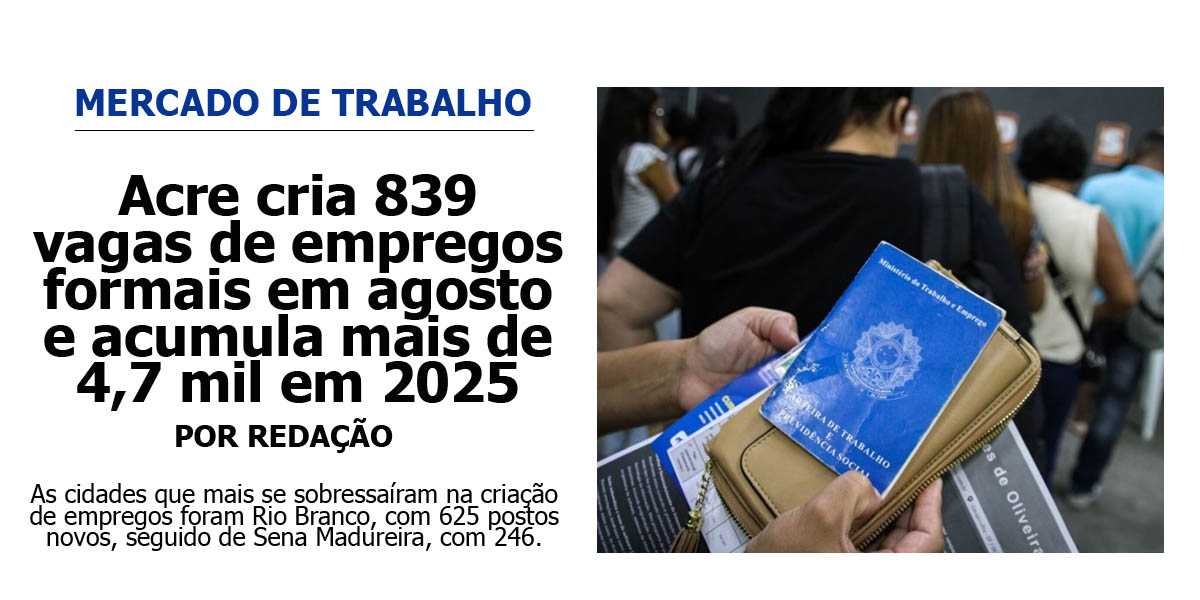 Acre cria 839 vagas de empregos formais em agosto e acumula mais de 4,7 mil em 2025