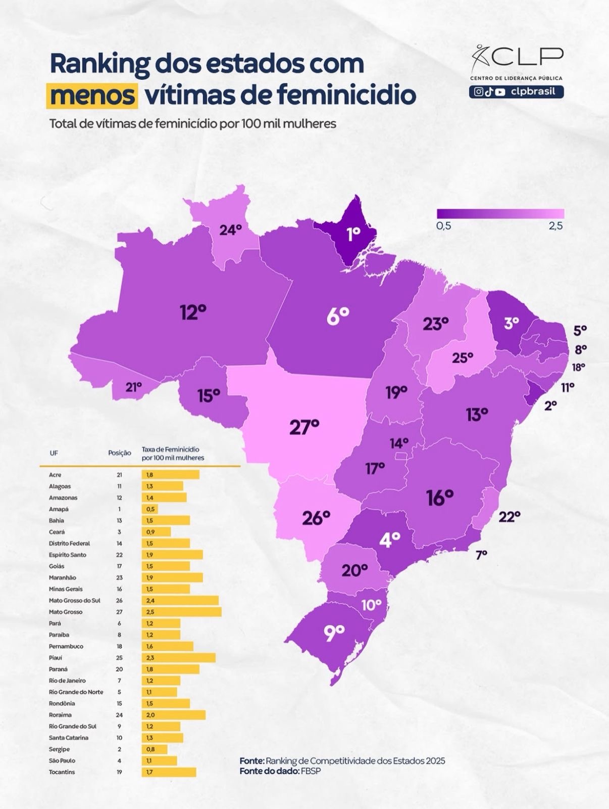 O Acre aparece em 21º lugar no Ranking de Competitividade dos Estados 2025, no indicador que mede a taxa de feminicídios no país. Segundo os dados do Fórum Brasileiro de Segurança Pública (FBSP), o estado registra 1,3 vítimas para cada 100 mil mulheres.