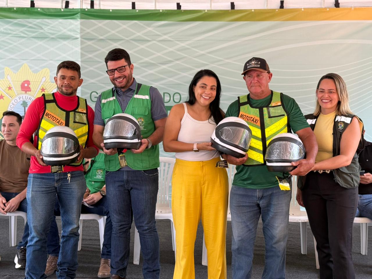 A presidente do Detran/AC, Taynara Martins, também participou da cerimônia e realizou a entrega de capacetes, coletes de identificação e Carteiras Nacionais de Habilitação (CNH) para mototaxistas da cidade, fortalecendo a segurança no trânsito e a formalização da categoria.