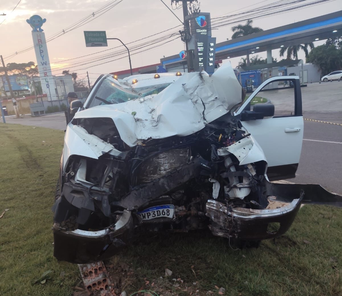 De acordo com informações da polícia, o motorista de uma caminhonete, que não teve o nome revelado, perdeu o controle da direção e colidiu o veículo contra um poste na rotatória em frente ao posto Castanheira.
