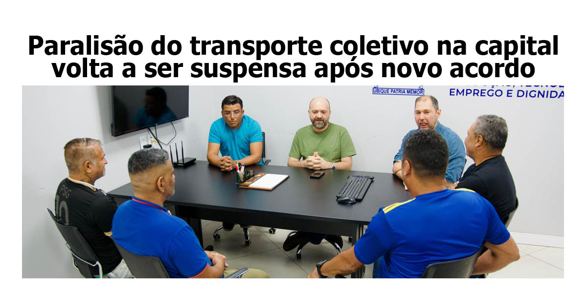 A paralisação dos trabalhadores do transporte coletivo de Rio Branco, prevista para esta sexta-feira (12), foi suspensa após reunião realizada nesta quinta-feira (11) entre representantes da Prefeitura, da Câmara Municipal e do Sindicato dos Trabalhadores em Transporte Público do Acre (Sinttpac).