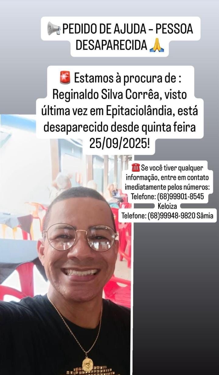 O professor de dança e ex-diretor de cultura de Epitaciolândia, Reggis Silva, está desaparecido desde a noite da última quinta-feira, 25. Muito conhecido na região por sua atuação cultural e pelo trabalho social desenvolvido em projetos de dança nos municípios de Epitaciolândia e Brasiléia, Reggis é considerado uma figura querida e respeitada pela comunidade.