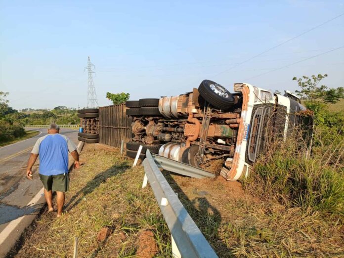 De acordo com informações de testemunhas, o veículo teria perdido o controle durante a madrugada e acabou virando na pista. Graças à defensa metálica instalada na lateral da rodovia — conhecida como guard rail —, a carreta não caiu em uma ribanceira, o que poderia ter provocado uma tragédia ainda maior.