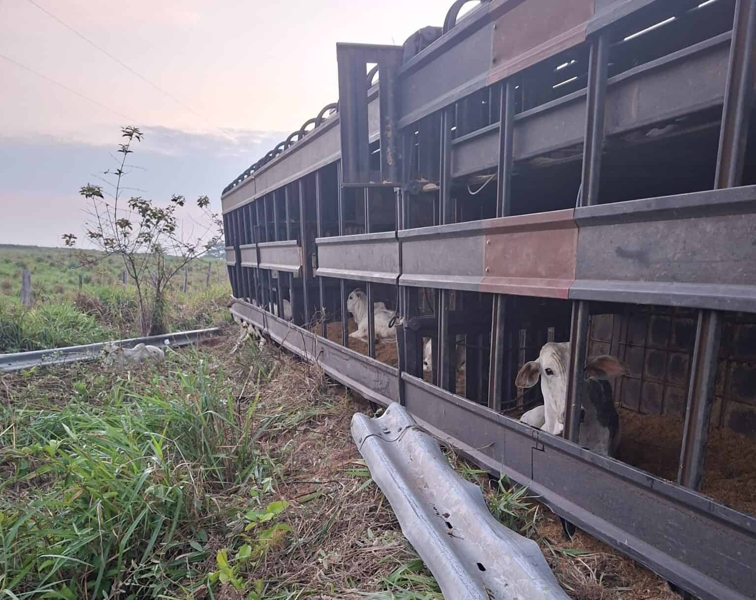 Carreta boiadeira tomba na BR-317 carregada com quase 140 bezerros