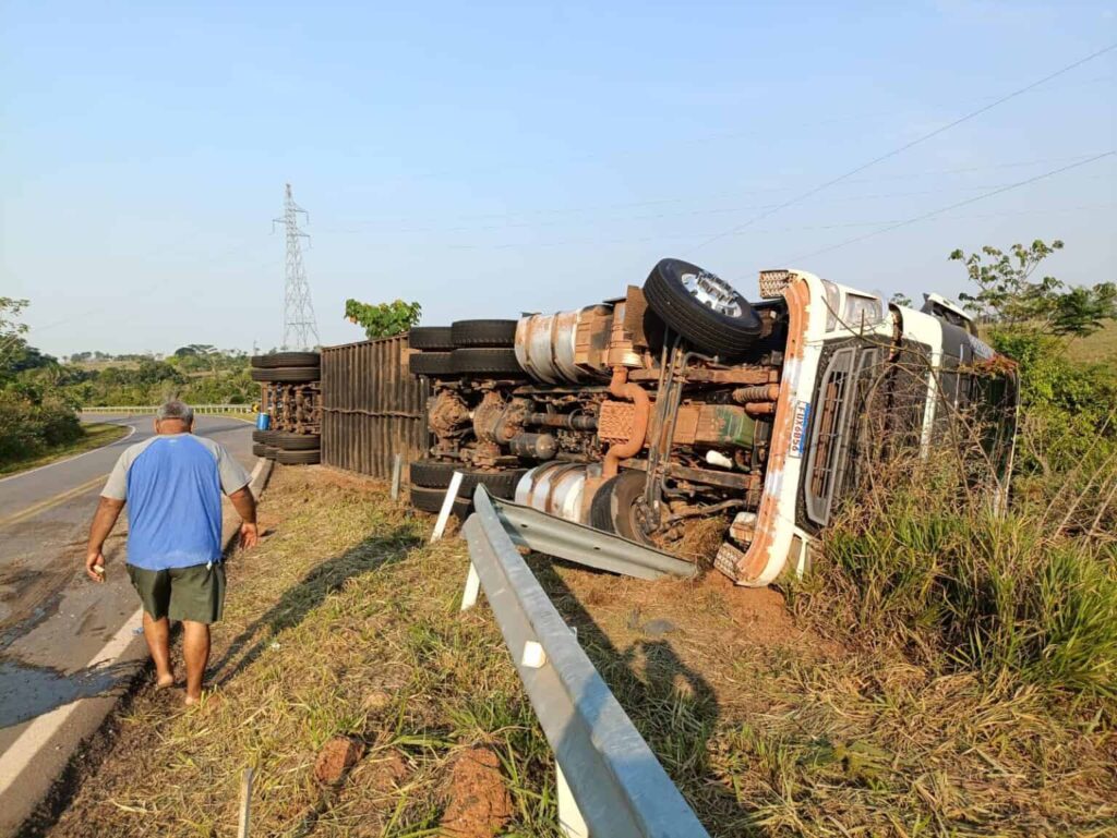 De acordo com informações de testemunhas, o veículo teria perdido o controle durante a madrugada e acabou virando na pista. Graças à defensa metálica instalada na lateral da rodovia — conhecida como guard rail —, a carreta não caiu em uma ribanceira, o que poderia ter provocado uma tragédia ainda maior.