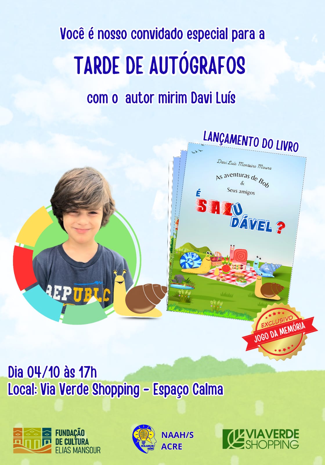 O estudante Davi Luís Monteiro Moura, de 7 anos, lança neste sábado (4/10), às 17h, seu primeiro livro infantil. Com o título “É saudável?”, a obra será apresentada no Espaço Calma do Via Verde Shopping, em Rio Branco (AC), com entrada gratuita. A programação inclui sessão de autógrafos, brincadeiras e atividades educativas.