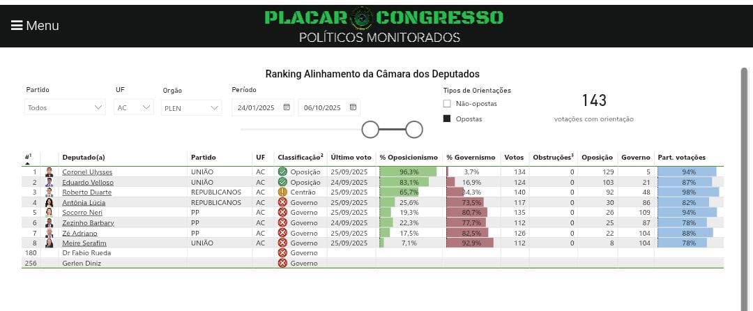 Segundo levantamento — ilustrado no print abaixo —, desde o início da atual legislatura, Coronel Ulysses deixou de acompanhar o governo em 84,9% das votações submetidas ao Plenário da Câmara dos Deputados. Em um recorte mais recente, considerando apenas este ano, o índice chega a 96,3%, consolidando-o como o maior opositor ao Governo Federal entre os deputados acreanos.