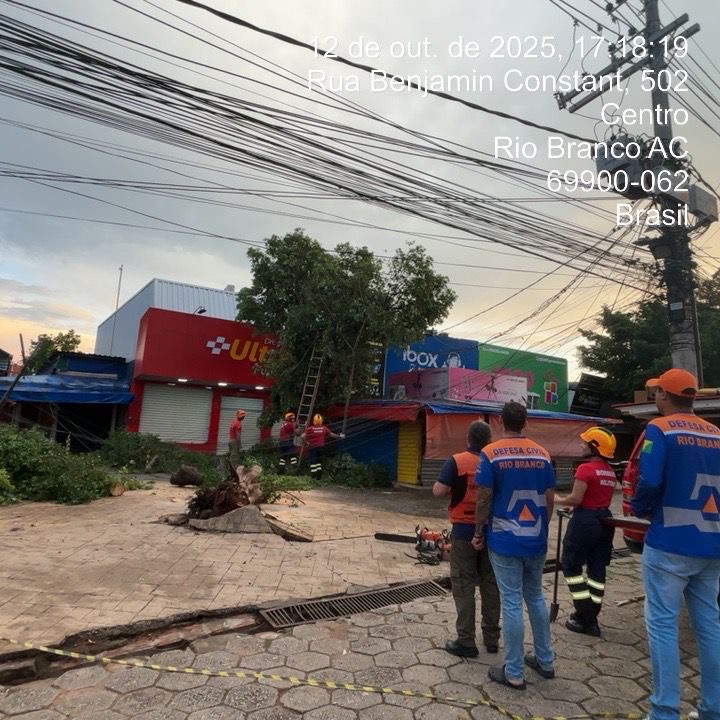 As equipes da Defesa Civil Municipal e do Corpo de Bombeiros do Acre atuaram de forma conjunta no atendimento das ocorrências, priorizando a retirada de árvores caídas e a segurança dos moradores atingidos.
