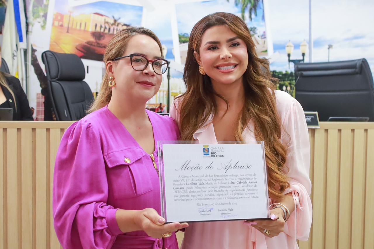 A Câmara de Vereadores de Rio Branco realizou, nesta quinta-feira, 16, uma sessão especial marcada por emoção e reconhecimento. Durante o evento, a vereadora Lucilene Vale (PP) concedeu uma Moção de Aplauso a mulheres que se destacam pelo trabalho social e profissional desenvolvido na capital acreana. Entre as homenageadas, esteve uma parte da equipe do Instituto de Terras do Acre (ITERACRE), responsável por transformar a vida de milhares de famílias por meio da regularização fundiária.