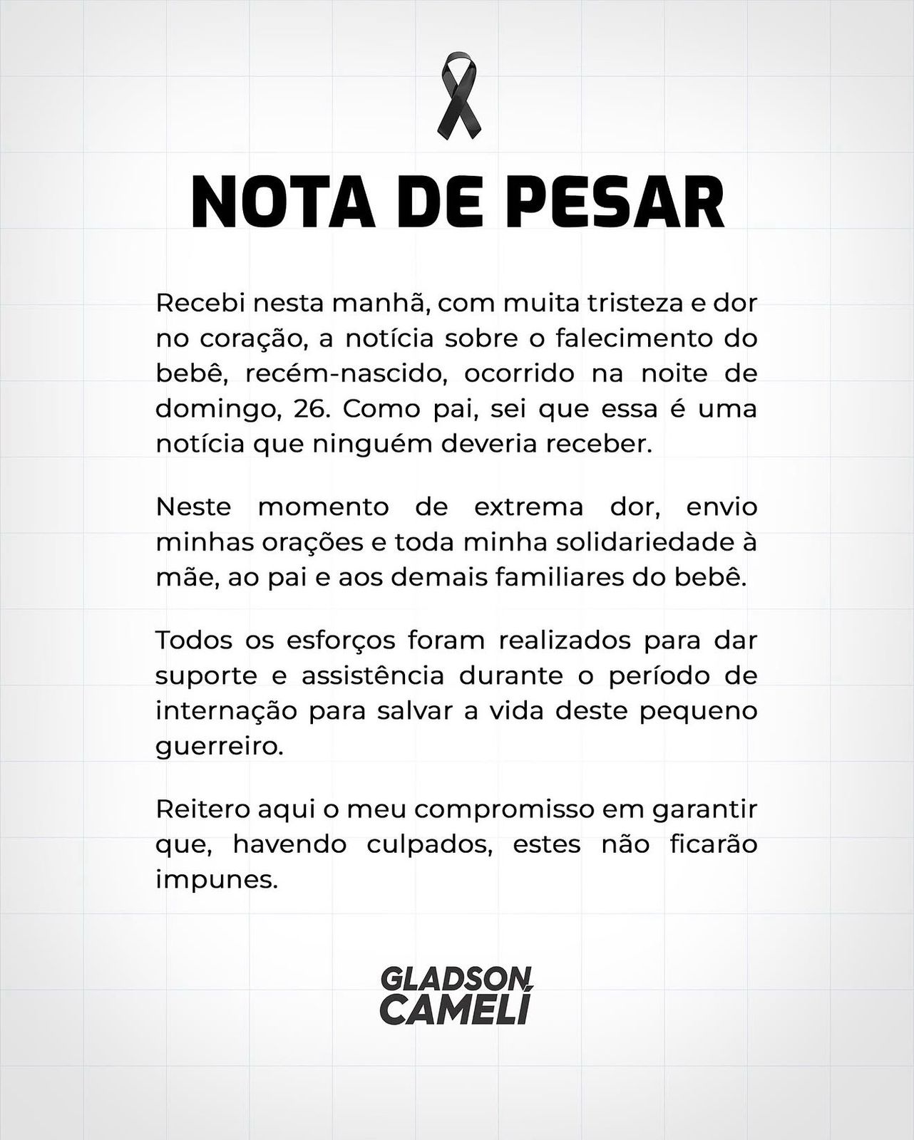 Gladson afirmou ainda que todos os esforços médicos foram realizados para salvar a vida do recém-nascido e garantiu que o caso será devidamente apurado.