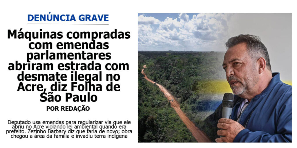 Deputado usa emendas para regularizar via que ele abriu no Acre violando lei ambiental quando era prefeito. Zezinho Barbary diz que faria de novo; obra chegou a área da família e invadiu terra indígena