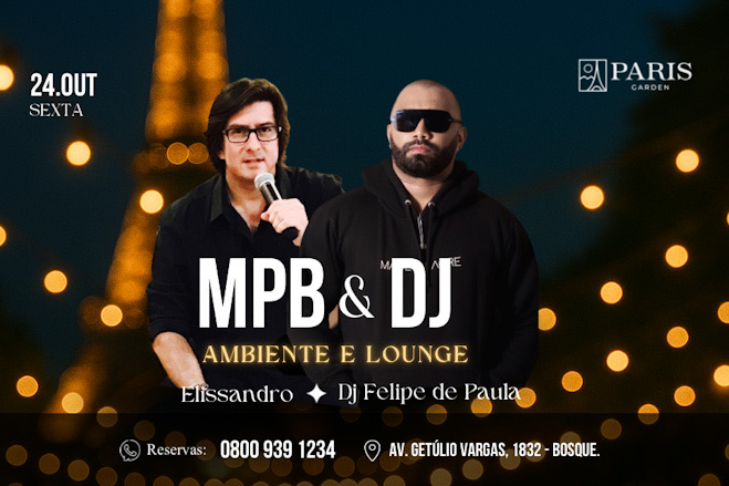 O Paris Garden prepara uma noite especial nesta sexta-feira (24), com uma programação que une o melhor da música popular brasileira e o clima envolvente do lounge. O evento traz o cantor Elissandro e o DJ Felipe de Paula, garantindo um repertório que vai do MPB clássico à batida moderna da música eletrônica.
