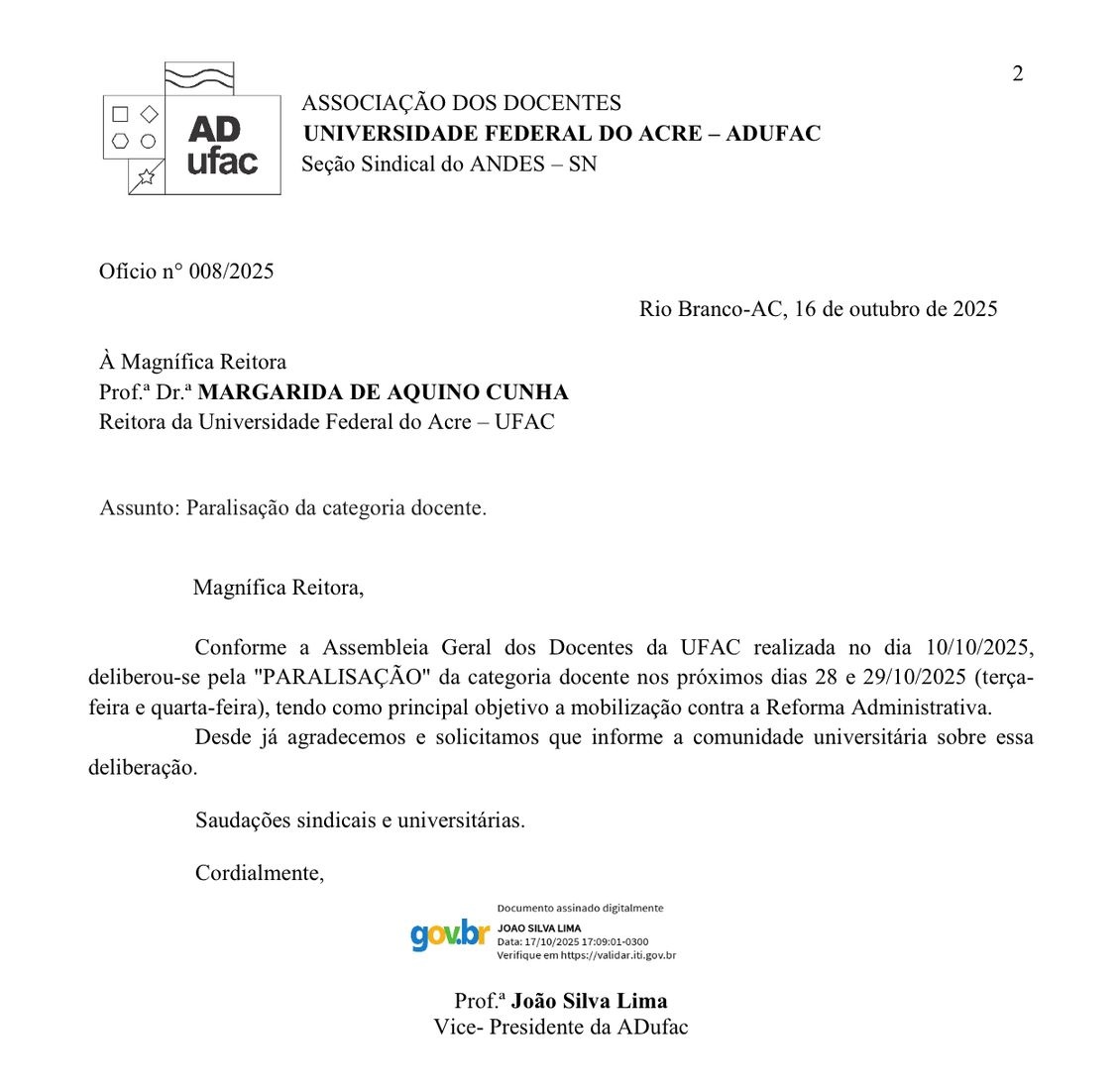 Em ofício enviado à reitora, professora Margarida de Aquino Cunha, a vice-presidente da Adufac, professora João Silva Lima, solicitou que a administração superior da universidade informe a comunidade acadêmica sobre a paralisação e seus efeitos.
