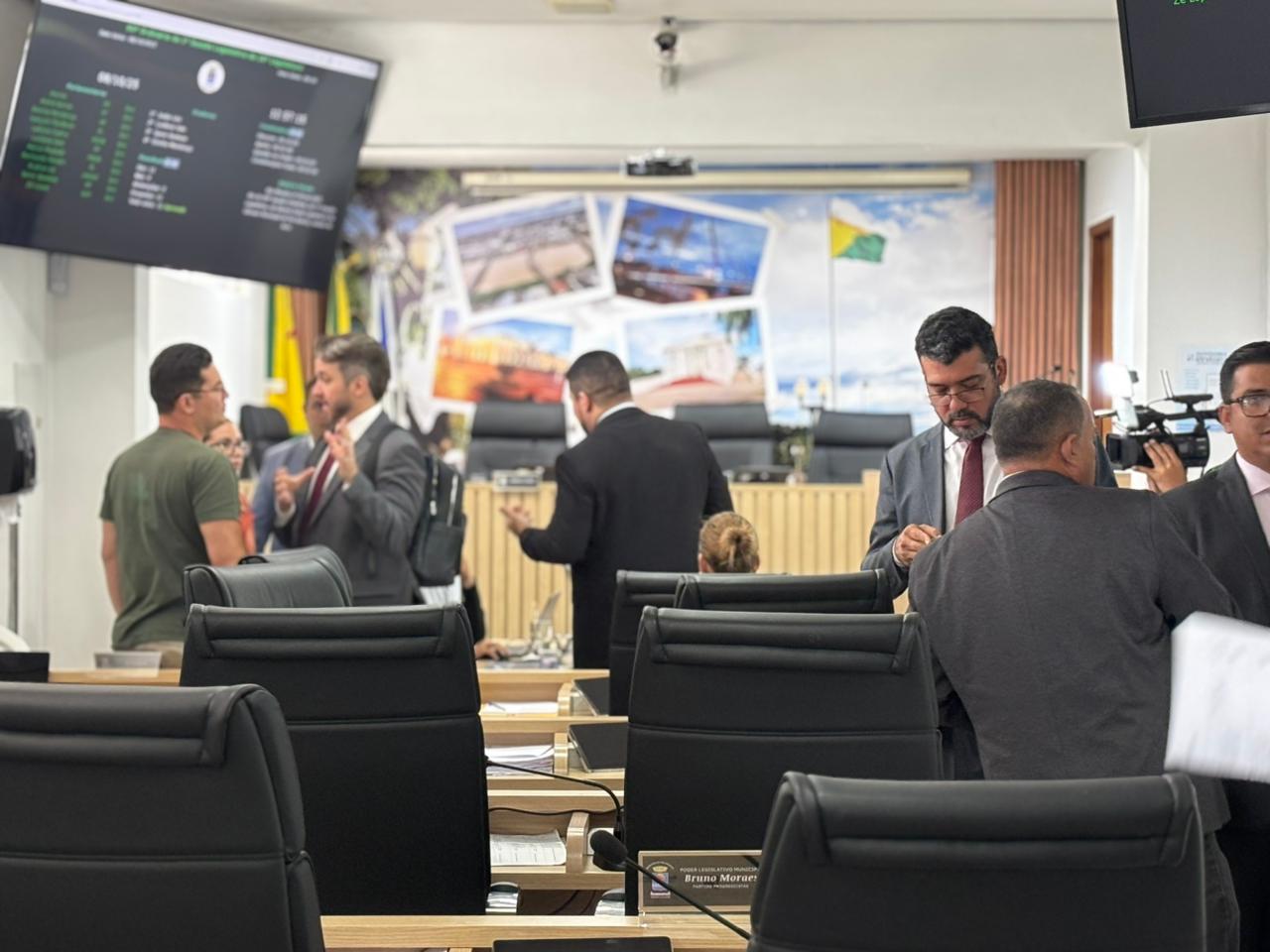 Durante a suspensão, os vereadores se reuniram na sala de reuniões da Câmara, onde aproveitaram o momento para tomar café e conversar sobre pautas da Casa.
