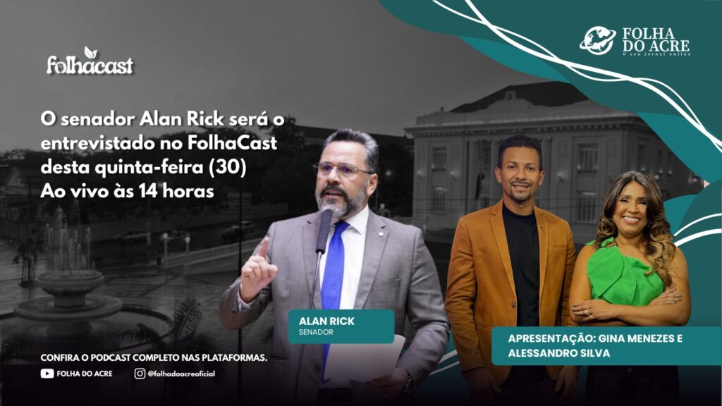 O senador Alan Rick será o convidado do FolhaCast, podcast oficial do Jornal Folha do Acre, nesta quinta-feira (30), a partir das 14 horas, com transmissão ao vivo pelas plataformas digitais do jornal.