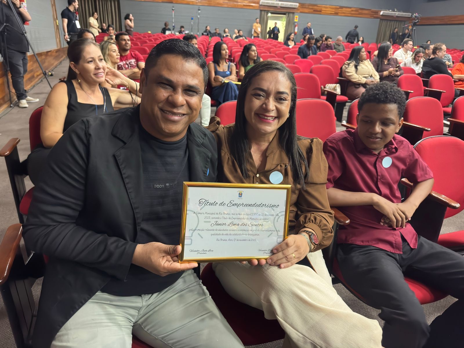 Entre os homenageados, o empresário Júnior Lima de Santos, proprietário da “Acabes no Bolso”, recebeu o título de Empreendedor de Rio Branco, indicado pelo vereador Zé Lopes (UB). Atuante há mais de 15 anos no setor de confecção, Júnior relembrou os desafios do início do negócio.
