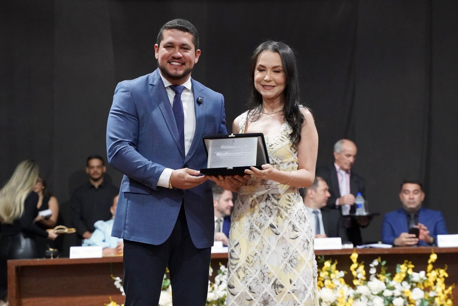 Encerrando a noite, o vereador Moacir Júnior (Solidariedade) entregou o título de Mulher Destaque à diretora da Casa Civil, Taiane Santos. Em seu discurso, ela destacou a luta diária das mulheres por espaços de representatividade.