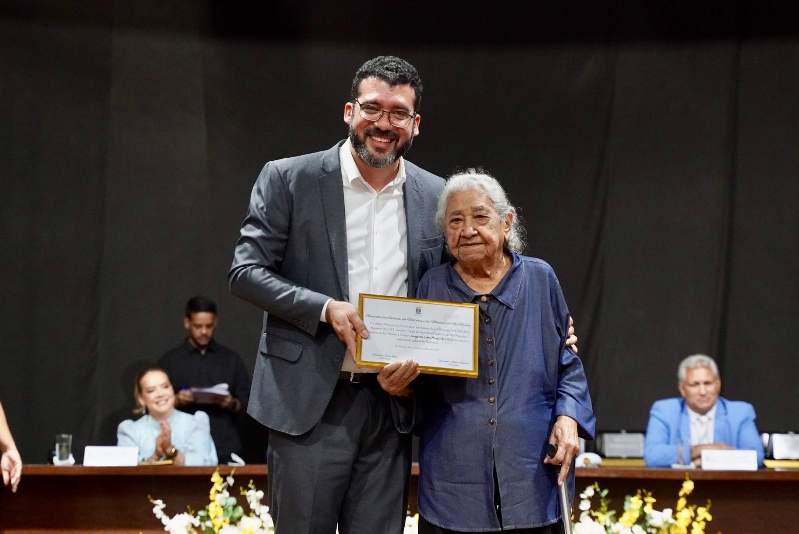 Outro momento de forte emoção ocorreu na entrega do título Guardião da Cultura e da Memória de Rio Branco, indicada pelo vereador André Kamai (PT), à senhora Guajarina Margarida, de 90 anos. Quatro décadas de sua vida foram dedicadas à preservação cultural da capital. Uma das criadoras do grupo folclórico “As Pastorinhas”, no Segundo Distrito, ela foi surpreendida pela homenagem.