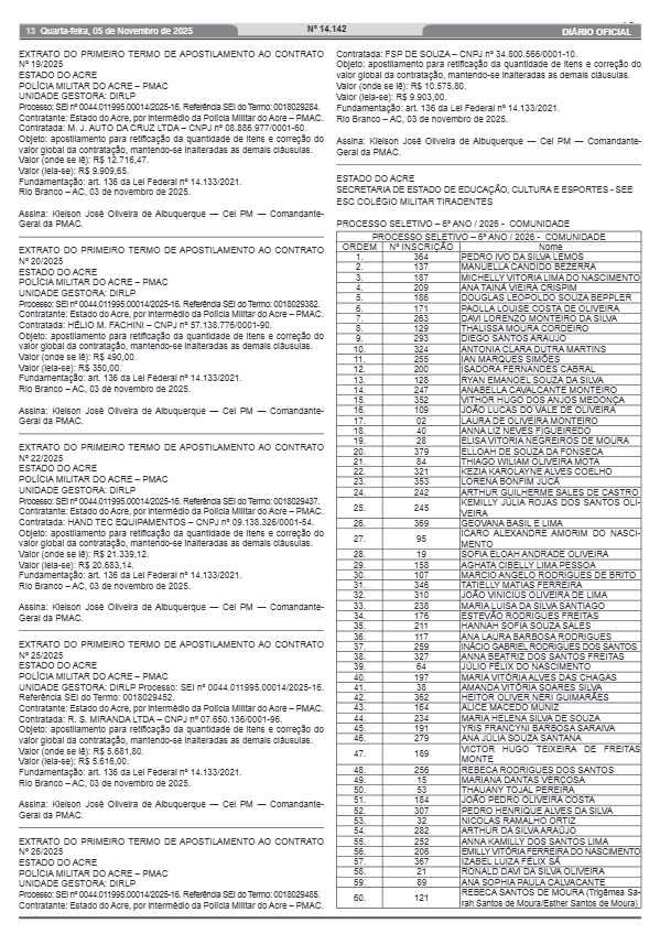 A Secretaria de Estado de Educação, Cultura e Esportes (SEE) divulgou, no Diário Oficial do Estado desta terça-feira (5), a lista final dos candidatos habilitados para a segunda fase do processo seletivo de ingresso no 6º ano do Ensino Fundamental II do Colégio Militar Estadual Tiradentes (CMET), em Rio Branco.