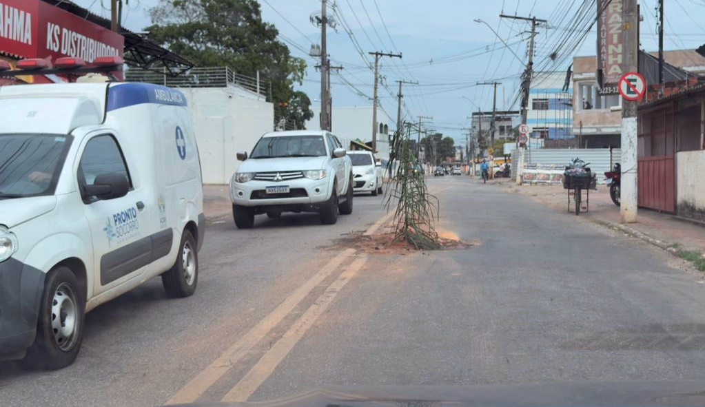 A cena foi registrada na manhã desta segunda-feira, 10, pela reportagem da Folha do Acre. No local, é possível ver o coqueiro plantado sobre o asfalto danificado, obrigando os condutores a desviar para evitar acidentes.