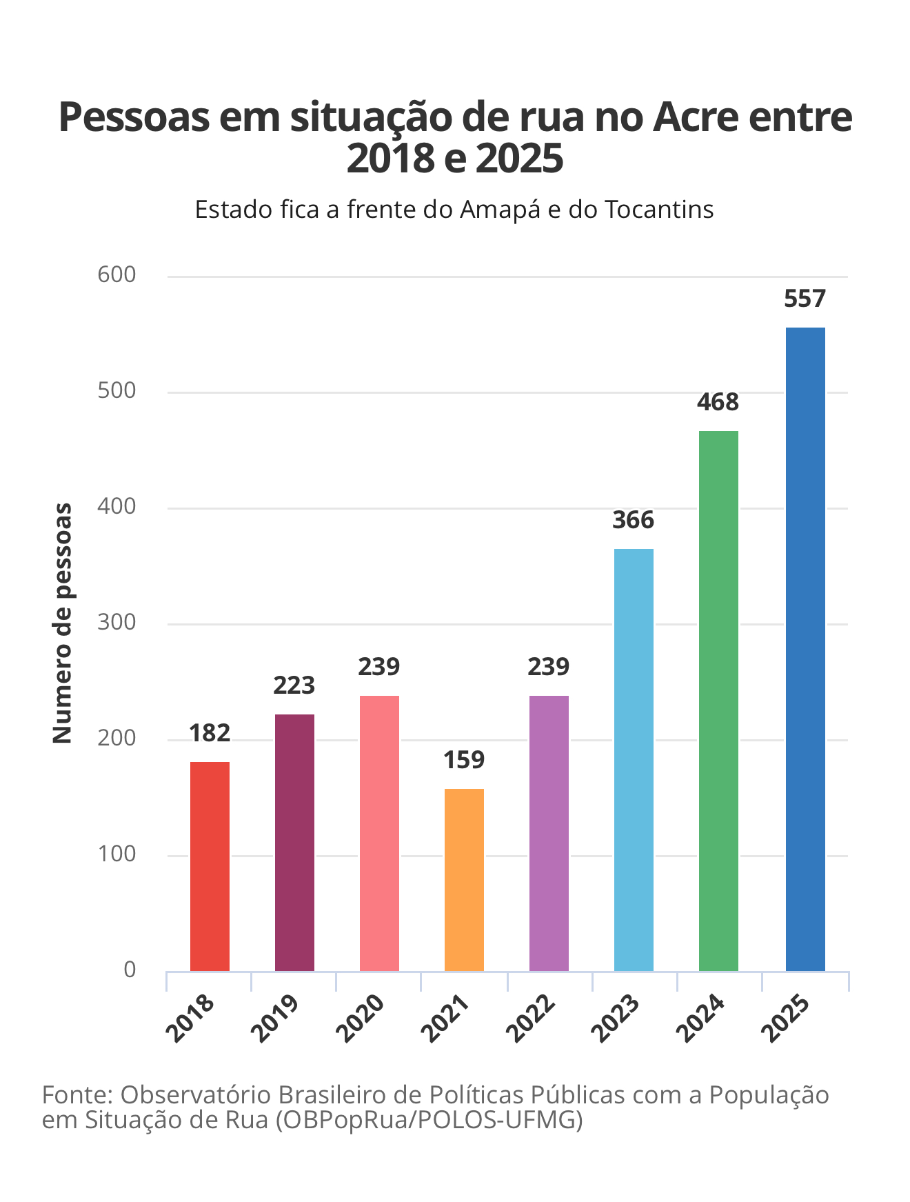 Segundo o levantamento, este é o maior índice registrado desde o início da pesquisa, em 2018, quando o Acre contabilizava cerca de 182 pessoas em situação de rua. Desde então, o número aumentou 32,6%, refletindo um crescimento gradual nos últimos anos.