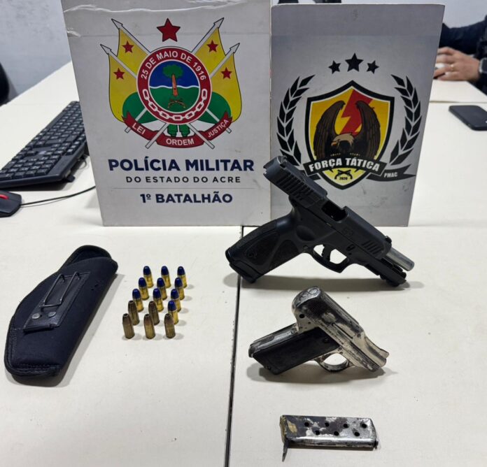 No início da noite desta sexta-feira (31), uma ação rápida e precisa da equipe da Força Tática do 1º Batalhão da Polícia Militar impediu um ataque criminoso que visava a execução de rivais em Rio Branco. A guarnição da Força Tática recebeu uma denúncia anônima informando que indivíduos ligados a uma facção estariam se reunindo com o objetivo de atacar rivais na região do Bairro Cadeia Velha. O ponto de encontro do grupo, segundo o denunciante, seria o estacionamento do Supermercado Atacale, localizado às margens da BR-364.