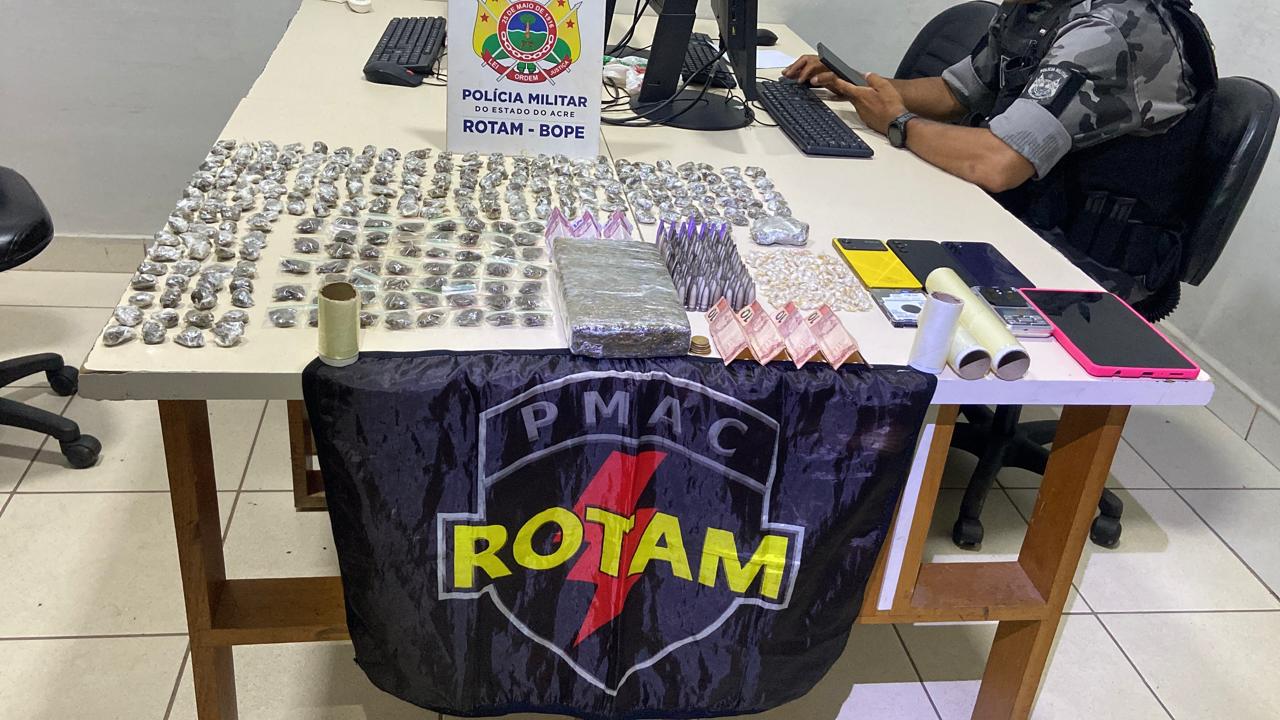 Após uma varredura no local, os militares localizaram 106 pinos de cocaína pura, 54 porções de maconha, um tijolo de maconha pesando 1 kg, 173 pedras de crack e 231 invólucros de maconha, além de quase R$ 60 reais em dinheiro, uma balança de precisão e material para embalagem das drogas.