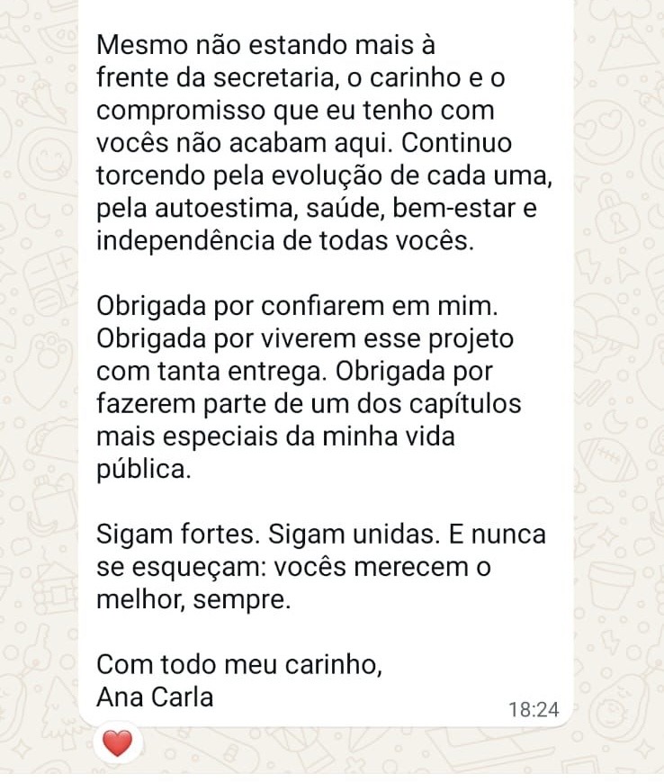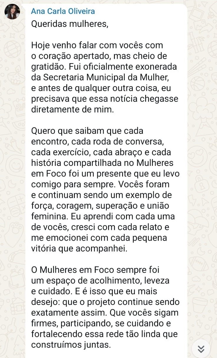 No texto enviado às participantes, Ana Carla informou que sua exoneração foi oficializada pela gestão municipal e afirmou que fez questão de comunicar pessoalmente às mulheres que frequentavam o projeto. “Fui oficialmente exonerada da Secretaria Municipal da Mulher e, antes de qualquer outra coisa, eu precisava que essa notícia chegasse diretamente de mim”, escreveu.