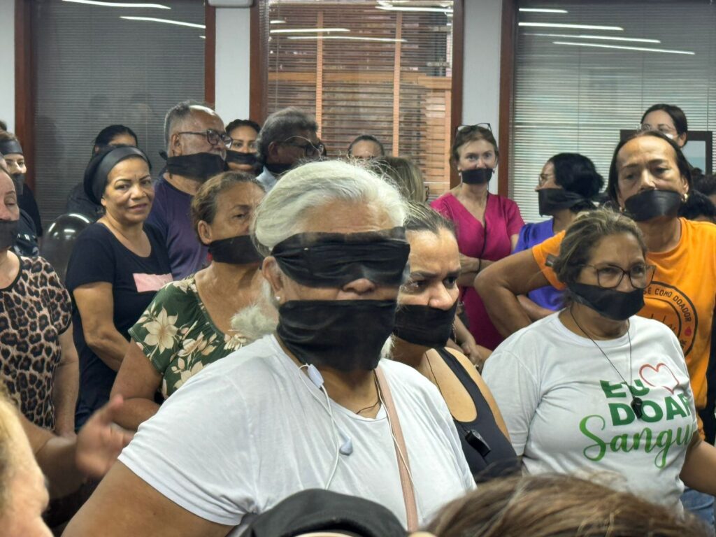 Profissionais de enfermagem realizaram um protesto silencioso e simbólico na manhã desta terça-feira, 18, no Salão Marina Silva, na Assembleia Legislativa do Acre (Aleac). Devido à decisão judicial que proibiu a greve da categoria, os trabalhadores decidiram tapar a boca com um pedaço de pano preto em sinal de repúdio e denúncia ao que chamam de tentativa de silenciamento.