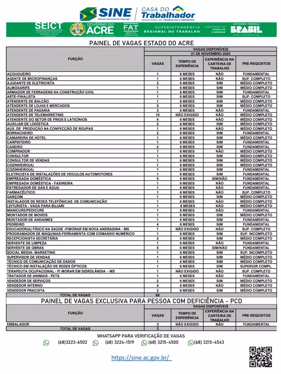 O cidadão também pode verificar se a vaga ainda está disponível através dos telefones (68) 3224 1519, (68) 3223 6502, (68) 3215 4500 e (68) 3215-4543, que também funcionam pelo WhatsApp.