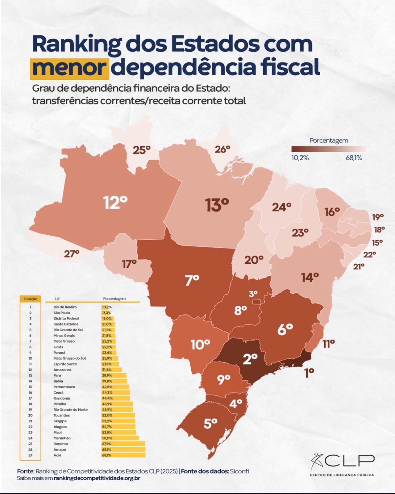 O Centro de Liderança Pública (CLP) divulgou o Ranking de Competitividade dos Estados 2025, destacando o grau de dependência fiscal de cada unidade da federação — indicador que mostra quanto da receita de um estado tem origem em transferências correntes da União.