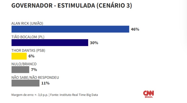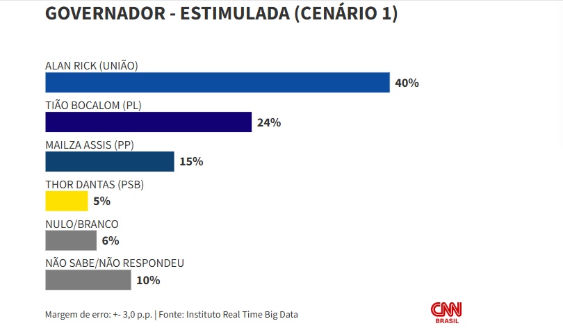 O senador Alan Rick (Republicanos) lidera todos cenários em uma eventual disputa ao governo do Acre no ano que vem, segundo pesquisa do instituto Real Time Big Data divulgada nesta segunda-feira (15).