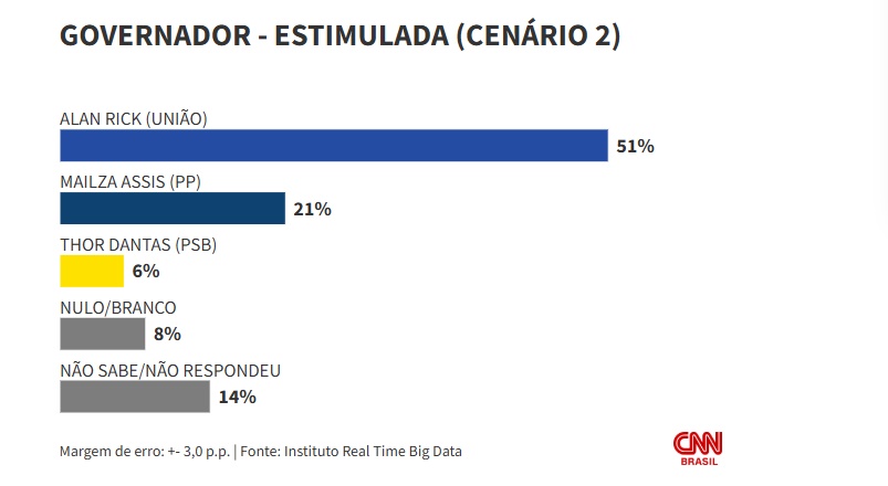 No primeiro deles, Alan lidera com 40%, contra 24% do prefeito de Rio Branco, Tião Bocalom (PL). A atual vice-governadora Mailza Assis (PP) soma 15% e o médico e pré-candidato ao governo, Thor Dantas (PSB), 5%.