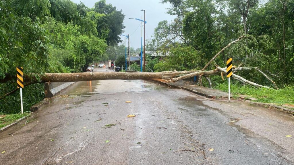 A forte chuva que atinge Rio Branco na tarde desta segunda-feira (8/12) tombou uma árvore na cabeceira da ponte sobre o Igarapé São Francisco, no bairro Placas. O bloqueio, causado após a queda de galhos nos fios de alta tensão, interrompeu o acesso de veículos à região e deixou moradores sem energia elétrica.