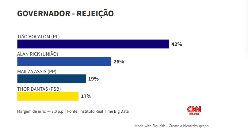 Segundo a pesquisa, Bocalom tem 42% de rejeição entre os eleitores acreanos. O prefeito da capital acreana é seguido de Alan Rick com 24% de rejeição. Mailza aparece com 15% e Thor Dantas 5%. Brancos e nulos somam 6%. Não sabem ou não responderam são 10%.