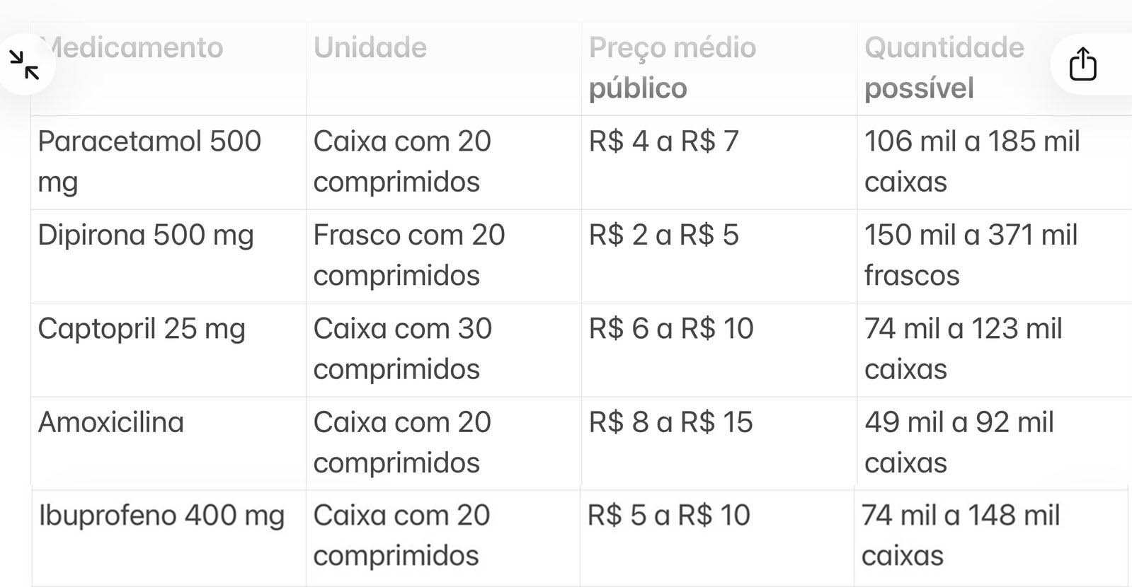 Com os mesmos R$ 743 mil, a prefeitura poderia ter reforçado significativamente a rede de saúde. Considerando preços médios praticados em compras públicas, o valor permitiria a aquisição de grandes quantidades de medicamentos essenciais, como: