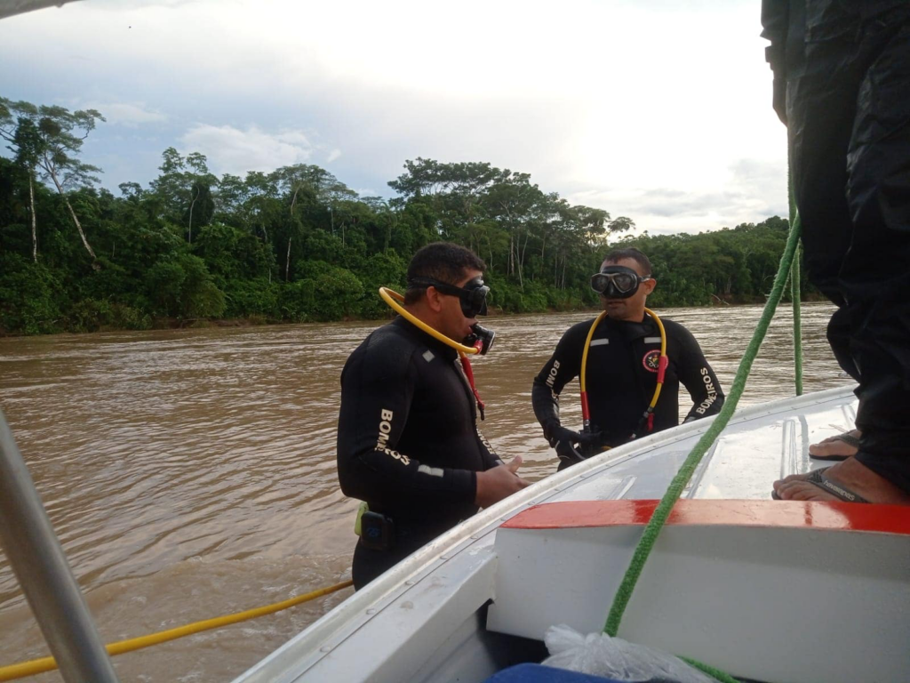 Homens do Corpo de Bombeiros seguem as buscas pela pequena Emily Lorrane de Oliveira da Silva, de 1 ano e oito meses, que desapareceu na segunda-feira (29) após um acidente entre duas embarcações no Rio Tarauacá, no interior do Acre.