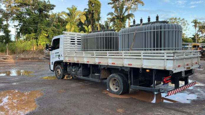 Caminhão do SAERB fazendo a retirada dos transformadores emprestados por um empresário à prefeitura de Rio Branco – Foto: Folha do Acre