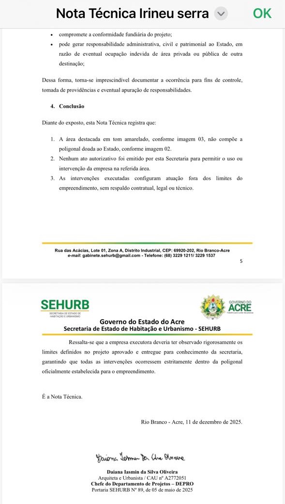 Segundo a Sehab, a construtora Newen teria avançado além dos limites da poligonal originalmente doada pelo governo federal ao Estado do Acre, invadindo Área de Preservação Permanente (APP) e promovendo intervenções físicas fora do perímetro contratual. A secretaria sustenta que as intervenções ocorreram sem respaldo legal, contratual ou técnico, o que inviabiliza o prosseguimento regular das obras.