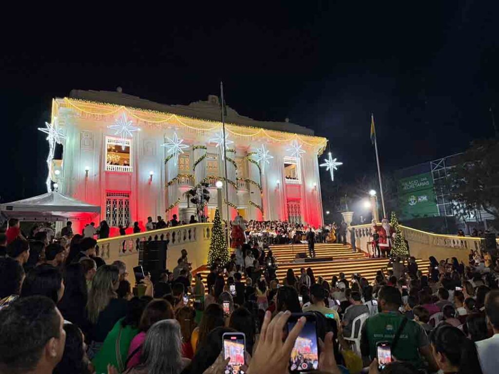 Uma multidão de rio-branquenses lotou a frente do Palácio Rio Branco, no centro da capital acreana, para acompanhar a inauguração da decoração natalina.