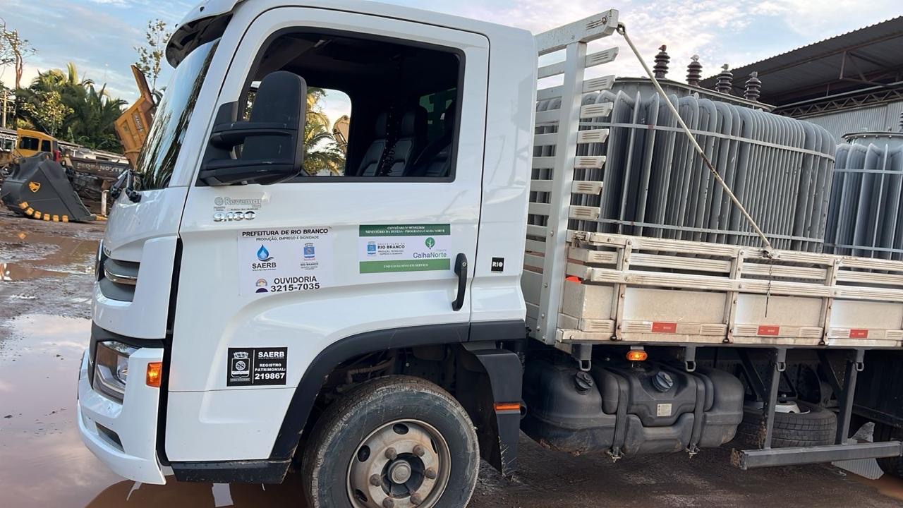 Uma fotografia mostra o caminhão oficial da Prefeitura de Rio Branco carregando o transformador. O equipamento, o layout visual do veículo e as placas operacionais coincidem com a documentação obtida.