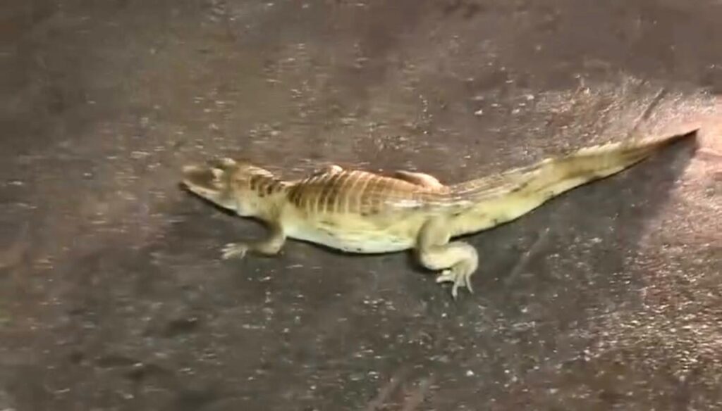 Um jacaré de aproximadamente 1 metro foi encontrado no meio da pista. O caso foi registrado por populares que presenciaram o episódio.