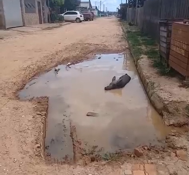Um fato inusitado chamou a atenção de moradores de Manoel Urbano e foi registrado por um morador no bairro Antônio Dias. Um porco foi flagrado “tomando banho” em um buraco cheio de água acumulada na Rua Manoel Batista. A cena ocorreu em meio às más condições da via, que apresenta pontos de erosão e poças formadas após as chuvas.