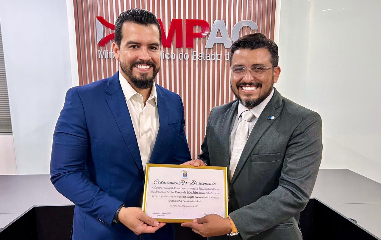 Em reconhecimento aos relevantes serviços prestados à sociedade e ao compromisso com a justiça, o vereador Aiache (PP) concedeu ao Promotor de Justiça da 1ª Promotoria Especializada de Defesa da Saúde, Dr. Ocimar Sales, o Título de Cidadão Rio-branquense. A honraria foi entregue na quarta-feira, 10, no Ministério Público do Estado do Acre (MP/AC).