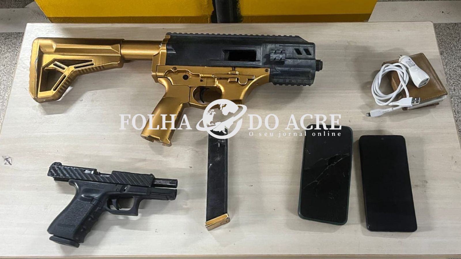 Duas armas de fogo também foram localizadas no interior do veículo, sendo uma pistola Glock G19, calibre 9mm, e uma submetralhadora de fabricação em impressora 3D modelo FGC-9 MK2, ambas com carregadores, porém, sem munições.